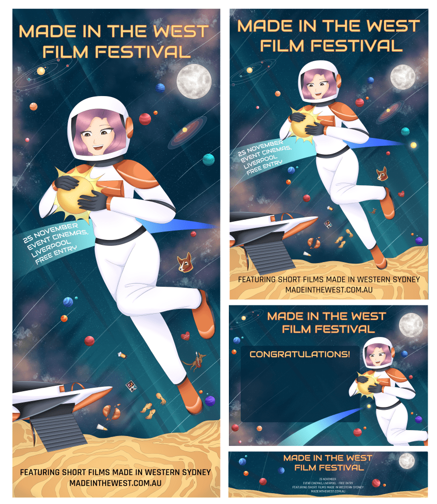 With each featuring the adventurous and strong-willed astronaut Laura, this set of collateral was designed during my time in the BURROW to focus on the festival’s aim to bring forward new ideas and perspectives through film from the heart of Western Sydney.
