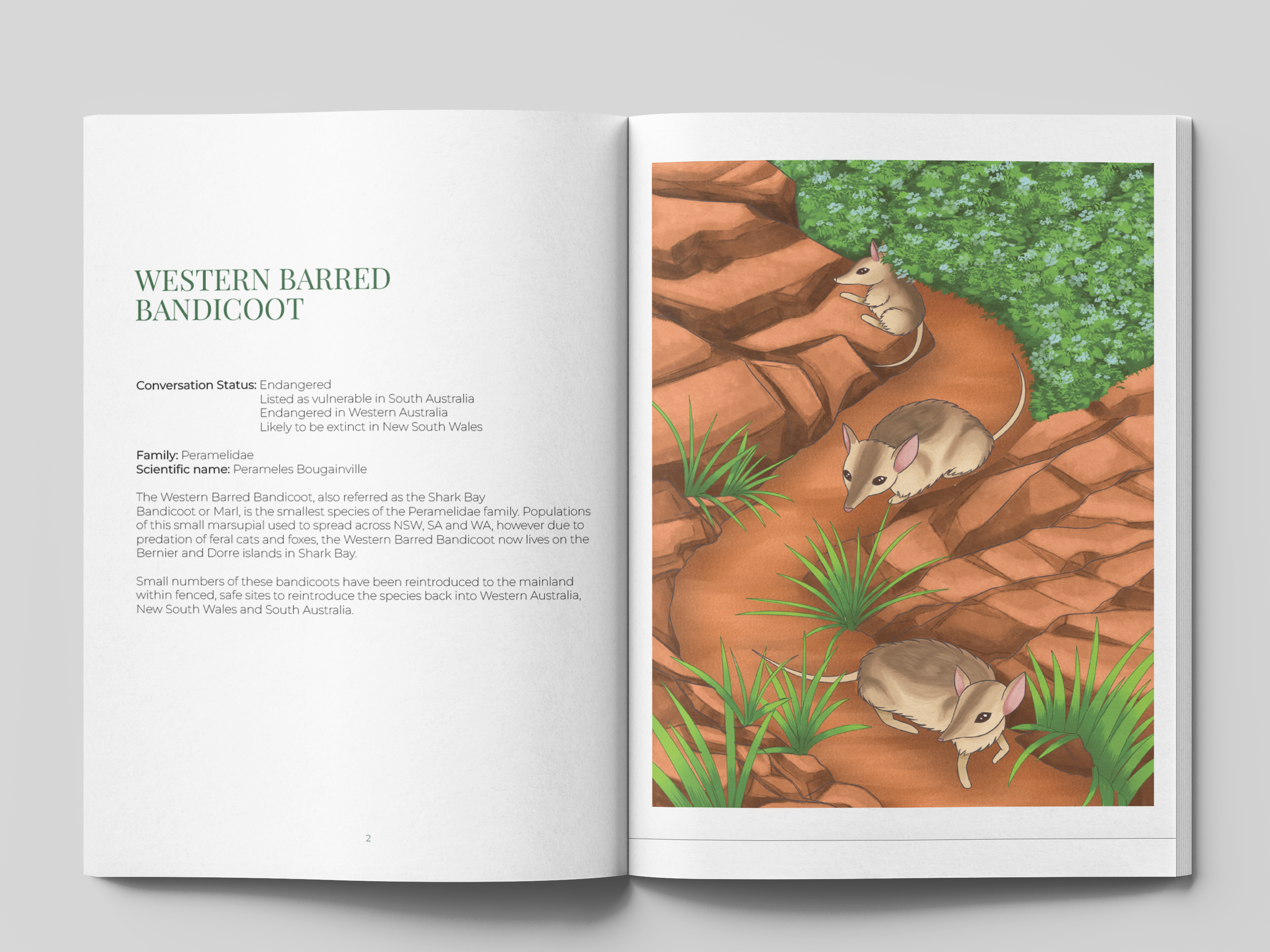 The project is made up of a small publication containing 10 animals listed as vulnerable, endangered or extinct on the EPBC Act list, a series of 20 A4 prints and 14 postcards.